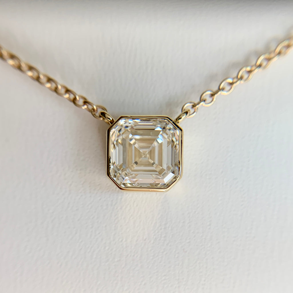 Custom made Asscher cut lab diamond necklace. The diamond is bezel set and attached to a solid and durable chain suitable for everyday wear. The chain is also adjustable between 16”, 17” and 18”. I chose a 1.5mm chain as a nice balance between dainty and sturdy. Most chains on similar designs are 1mm or less which can be prone to snapping. Brand new and comes with the IGI cert shown.